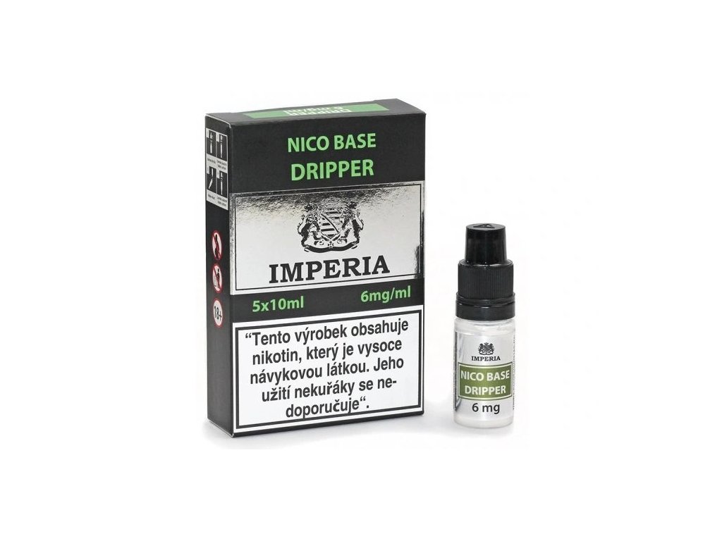 Báze IMPERIA Dripper 70/30 s koncentrací nikotinu 6 mg. Určena pro všechny typy vaporizačních zařízení (vapy). Poměr složek 70 % VG a 30 % PG zajišťuje optimální produkci páry a chuť.