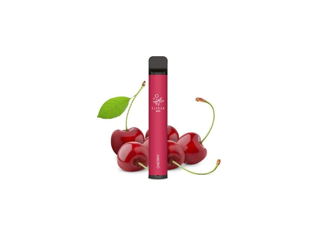 Jednorázová e-cigareta Elfbar 600 s kapacitou až 600 potahů. - Obsahuje 20 mg/ml nikotinové soli a příchuť Cherry. - Zařízení je přednaplněné, připravené k okamžitému použití, bez nutnosti nabíjení či plnění.
