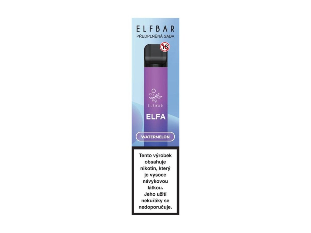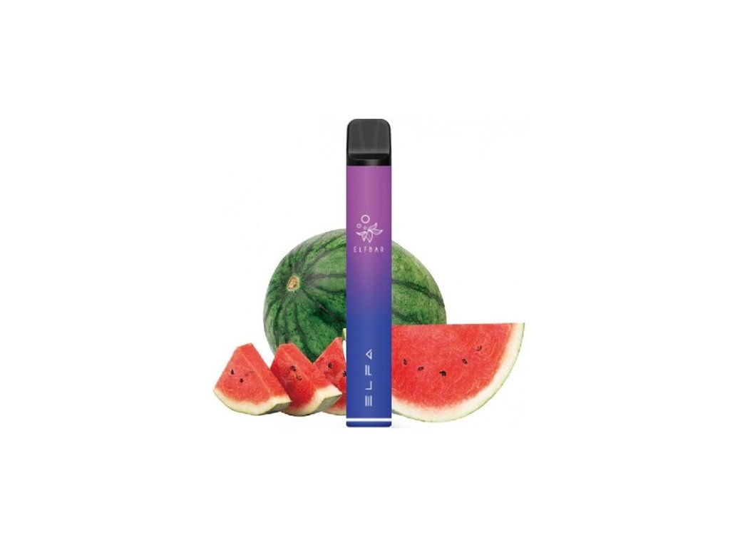 E-cigareta Elfbar Elfa s příchutí Watermelon. Obsahuje předplněnou cartridge s kapacitou 2 ml a nikotinovou solí 20 mg/ml. - Zařízení využívá technologii mesh coil pro rovnoměrné odpařování a intenzivní chuť.