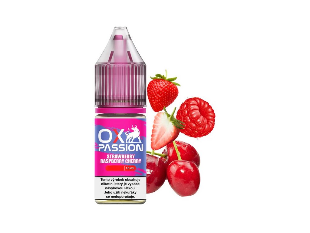 OXVA OX PASSION Salt Strawberry Raspberry Cherry spojuje sladkou jahodu, nakyslou malinu a šťavnatou třešeň v dokonale vyvážené směsi červených bobulí. Vyrobeno v poměru 50/50, ideální pro MTL e-cigarety a POD systémy s nikotinovou solí.