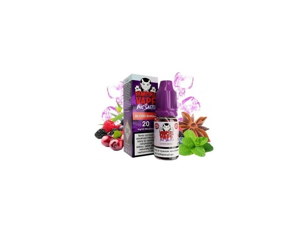 Vampire Vape NS Blood Sukka 20mg je nikotinová sůl určená pro použití v elektronických cigaretách. Produkt obsahuje směs nikotinové soli s koncentrací 20 mg/ml, která zajišťuje rychlejší vstřebávání nikotinu a hladší inhalaci ve srovnání s tradičními e-liquidy. Tato náplň je kompatibilní s nízkovýkonnými zařízeními typu pod systémů. Blood Sukka nabízí komplexní chuťový profil kombinující tóny červeného ovoce, třešní, bobulí a anýzu, doplněný o chladivý mentolový efekt. Produkt je balen v lahvičce o objemu 10 ml s bezpečnostním uzávěrem a splňuje veškeré legislativní požadavky EU týkající se e-liquidů.
