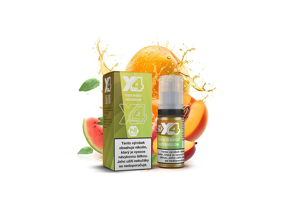 E-liquid X4 Peach Mango Watermelon 10mg je navržen pro uživatele elektronických cigaret, kteří hledají intenzivní chuťový zážitek s vyváženou koncentrací nikotinu. Tento produkt kombinuje svěží a sladké tóny broskve, manga a melounu, což zajišťuje příjemný a osvěžující pocit při každém potáhnutí.